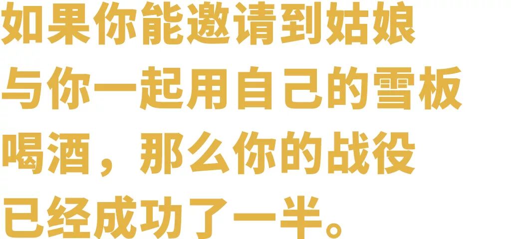 即便不说初级者必定要去的初级雪道,各大雪场的夜场也是泡妞的不二之地。日本斑尾高原滑雪场的日语发音为“MA DA RA O”,与日语“淫尾”(MI DA RA O)近似,那些雪地浪子干脆就叫这里“淫尾”。趁着夜间的灯光,无数个平成男孩都在这里成为了平成男人。其实在国内,滑雪曾经一直是一项筛选人群的运动,早年只有“有钱又有闲”的人才有资格参与。别以为会滑雪再拿着个gopro就是真正的pro了。男人的本质是舔狗,狗是无法在皑皑白雪前保持理智的。即使上了雪道,在姑娘眼里,你不过是另一只会滑雪的狗pro。去雪场开的商务MPV还是买菜车,雪服是AK457还是日产北脸,雪板是Nitro还是Capita······在雪场,真正的海王们是通过一整套的品牌筛选体系来判断,到底谁才能进入鱼塘。而当全民奔上了小康,当滑雪再也不是高端人士们专属的小众趣味,越来越多的人也加入到了这场白色爱情的游戏之中。初来乍到的我还在探索游戏规则时,勇于出击的玩家们早已披挂上阵。甚至遇到符合标准的猎物时,姑娘们也会大胆出击。