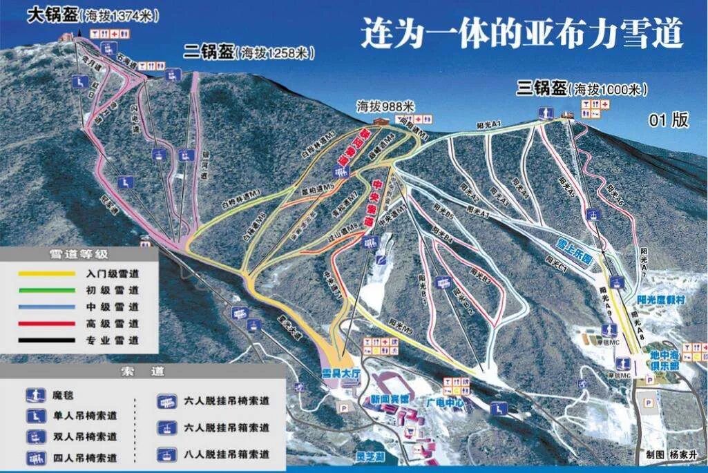 雪场现有雪道总长度约37公里,最大高度差达930米,国际标准雪道19条,国际标准单板U型槽及单板公园一座,滑雪跳台两座,自由式空中技巧滑雪台一座,旱地雪橇滑道一座;雪场有高山滑雪索道四条、托牵1条、魔毯3条。