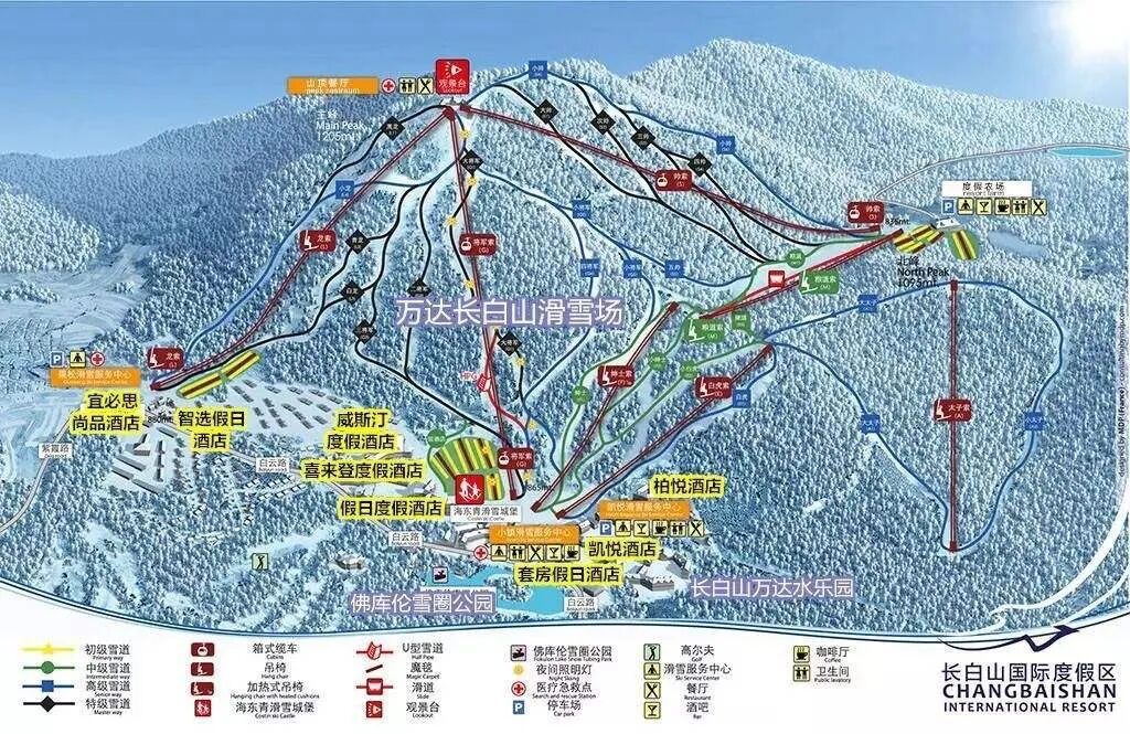 万达长白山国际度假区滑雪场位于吉林省白山市抚松县,总占地面积6.34平方公里,雪道面积94万平方米,造雪面积104万平方米。
