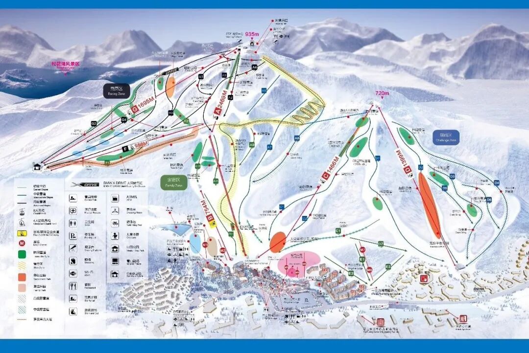 雪场初中高级雪道分布均匀,家庭滑雪乐园,专业教学公园,大众运动公园及竞技型运动公园,不同等级的滑雪者互不干扰,能够满足国际专业赛事和家庭度假需求。