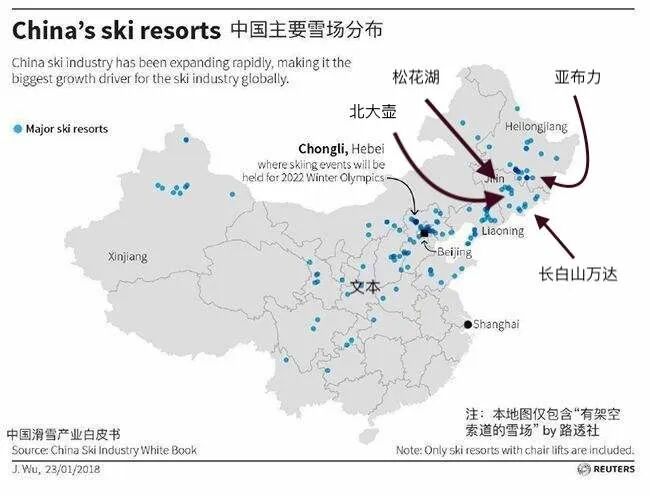 如图所示,东北地区主要滑雪场知名度较高的四个雪场,分别是亚布力滑雪场(包含亚布力阳光度假区、新体委滑雪场)、松花湖滑雪场(也就是万科松花湖度假区的前身)、北大壶滑雪场、万达长白山滑雪场。