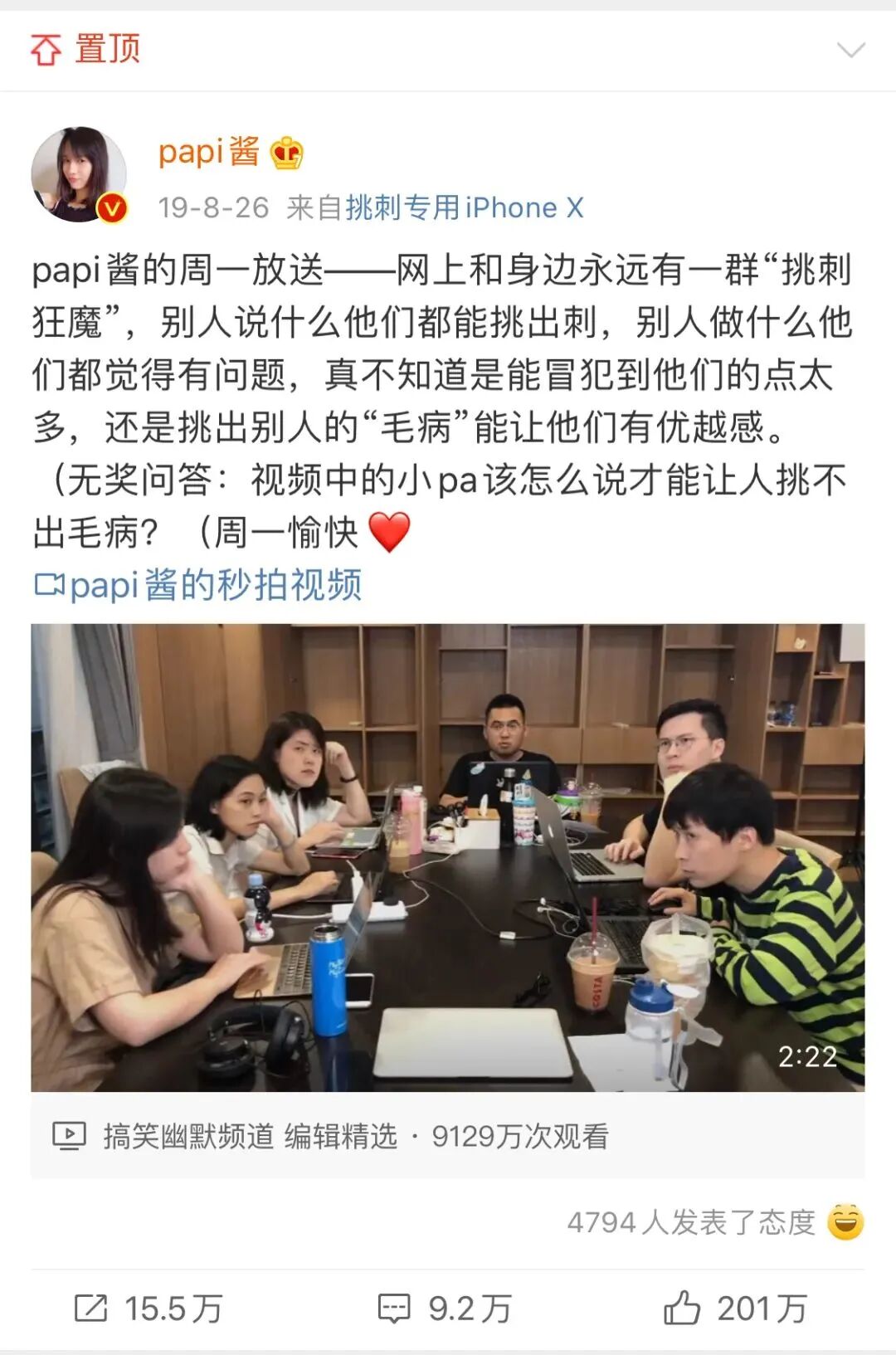 对此,papi没有下场和“女权”们互骂,而是默默把自己的微博置顶改成了如下视频: