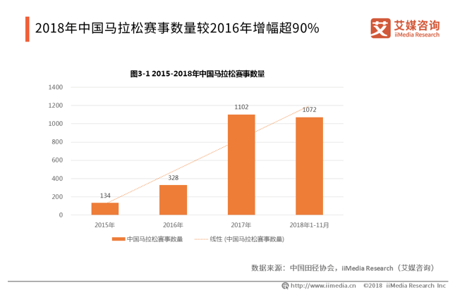 图说:2015-2018年中国马拉松赛事数据,来源/艾媒咨询。