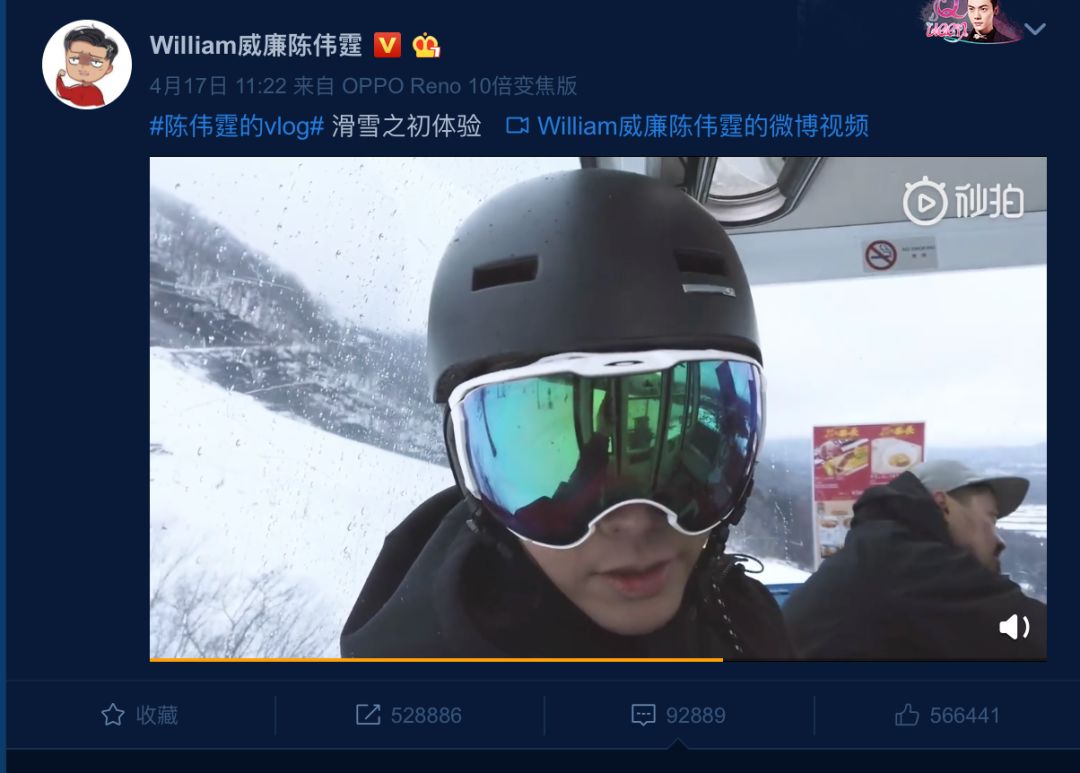 陈伟霆在17号的微博更新中,上传了自己滑雪初体验的vlog,视频中的他和几位好友一起同游日本,并且租车前往北海道滑雪。