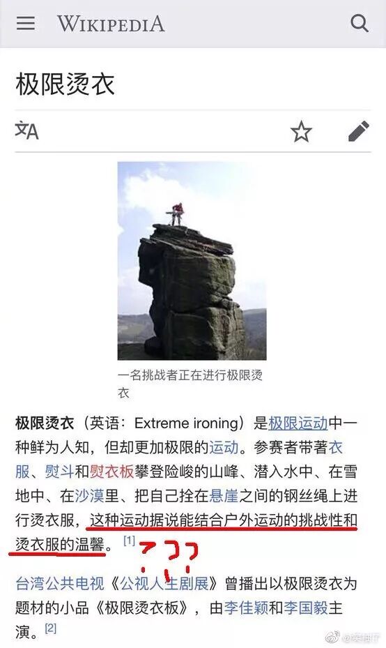 刚刚才知道极限运动里有一种鲜为人知的项目叫做极限烫衣,就是在做极限运动的同时,烫衣服……我去搜了一下,虽然很厉害,但是画风怎么怪怪的???