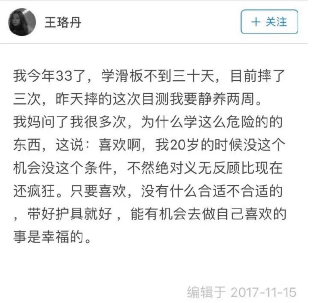 相比于以上两位,王珞丹算是“小有名气”,平时喊得比较响,据说很早就开始练习长板,还曾经在知乎上鼓励过想学滑板的小白。