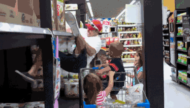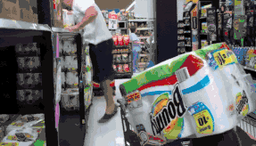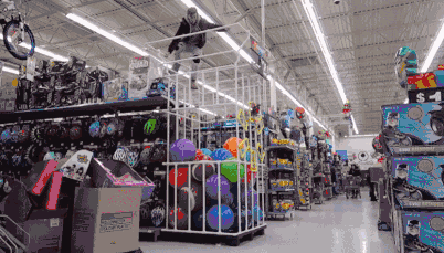 沃尔玛就像一块亟待开垦的沃土,码放齐整的货架成为跑酷儿的必经之路。