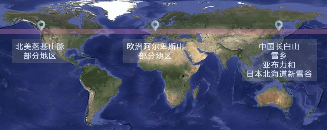 从左到右分别是北美落基山脉部分地区、欧洲阿尔卑斯山部分地区以及中国的长白山、雪乡、亚布力和日本北海道。