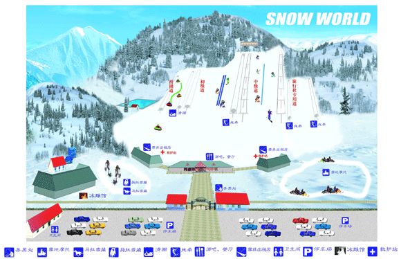 初、中、高级雪道7条、2条四人吊椅式索道、5套全自动雪地魔毯、7800余平米的多功能大厅集收银、租赁、餐饮、购物于一体