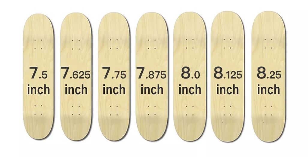 板面的尺寸主要指板面的宽度,因为长度都差不多。板面宽度比较主流的尺寸有7.5到8.25,窄一点到板面做动作会更轻巧一点,更灵活一点,也更不容易掌控。宽一点的板面会相对稳一点,做招也会相对费劲一些。其实差别不太大,8.0是最常见的尺寸,新手一开始选这个尺寸不会错。