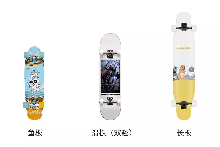 选择一块适合自己的滑板对于刚入坑的朋友来讲是非常重要且关键的一步,首先我们要正确地认识滑板。广义上滑板分很多类型,每种类型的滑板的功能和玩法都不一样。对新手而言,最开始接触到的滑板主要有双翘(滑板)、长板和鱼板。(除此之外还有很多其他滑板类型,比如游龙板、异形板、电动滑板等,这些一开始完全不用去考虑)