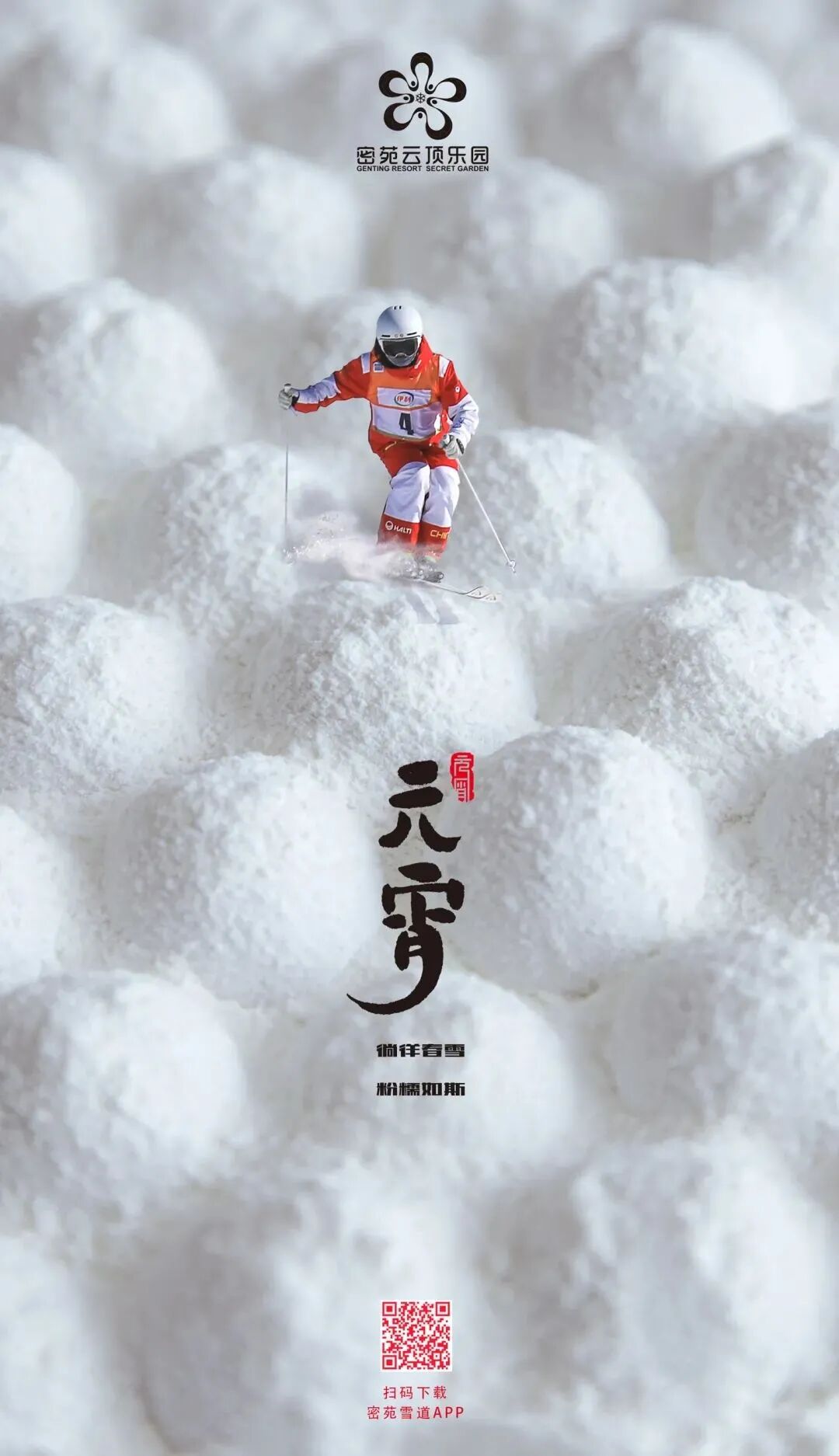 极限时间在云顶滑雪场的官方微信找到了这个图片,应该是这张创意海报的出处,海报将猫跳滑雪(mogul skiing)和元宵融为一体,创意十足。