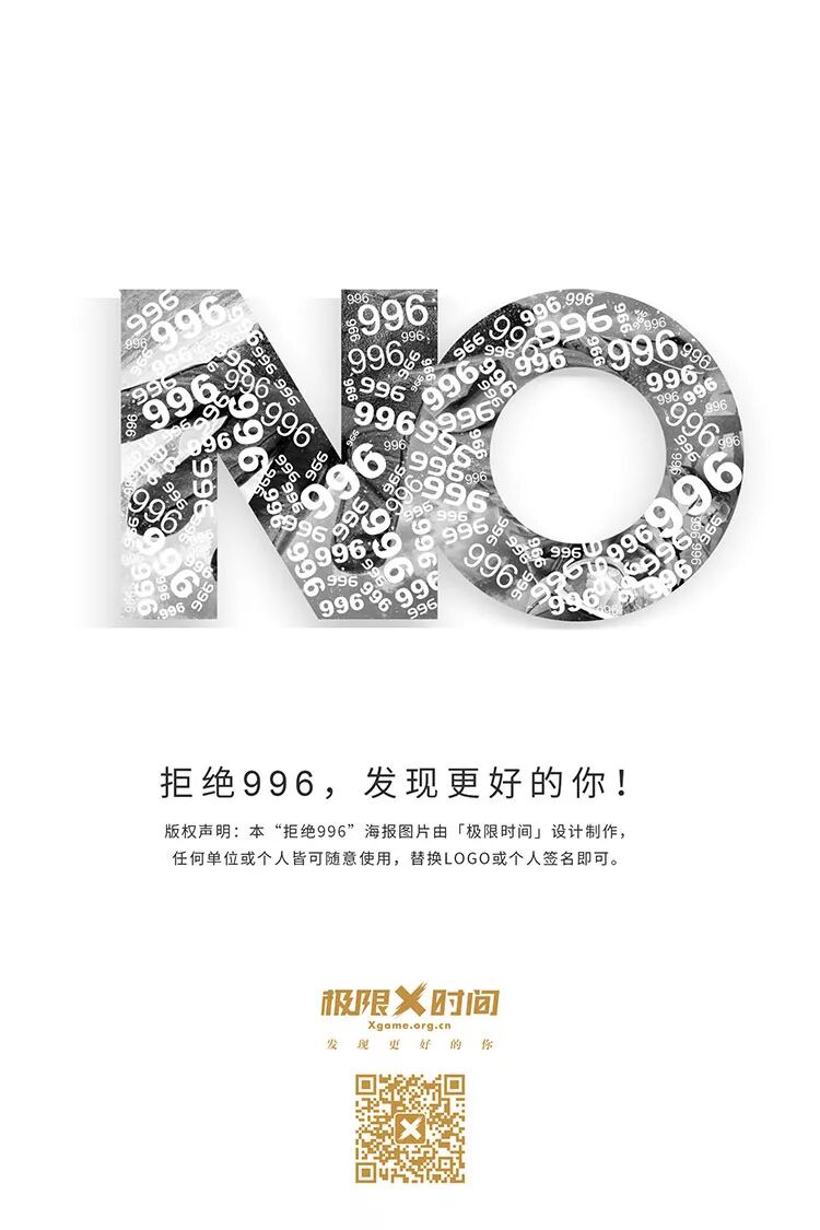 版权声明: 本“拒绝996”海报图片由「极限时间」设计制作,任何单位或个人皆可随意使用。