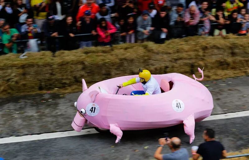 参赛者将车子打扮成各种奇怪的造型,在没有动力的情形下从420米的高山滑下来参加比赛。如此魔性的装备和上路方法,过程令人捧腹。(环球网)
