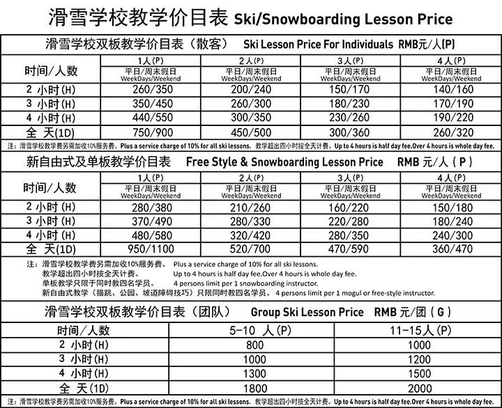 南山滑雪学校教学价目表 图片:南山滑雪场官网