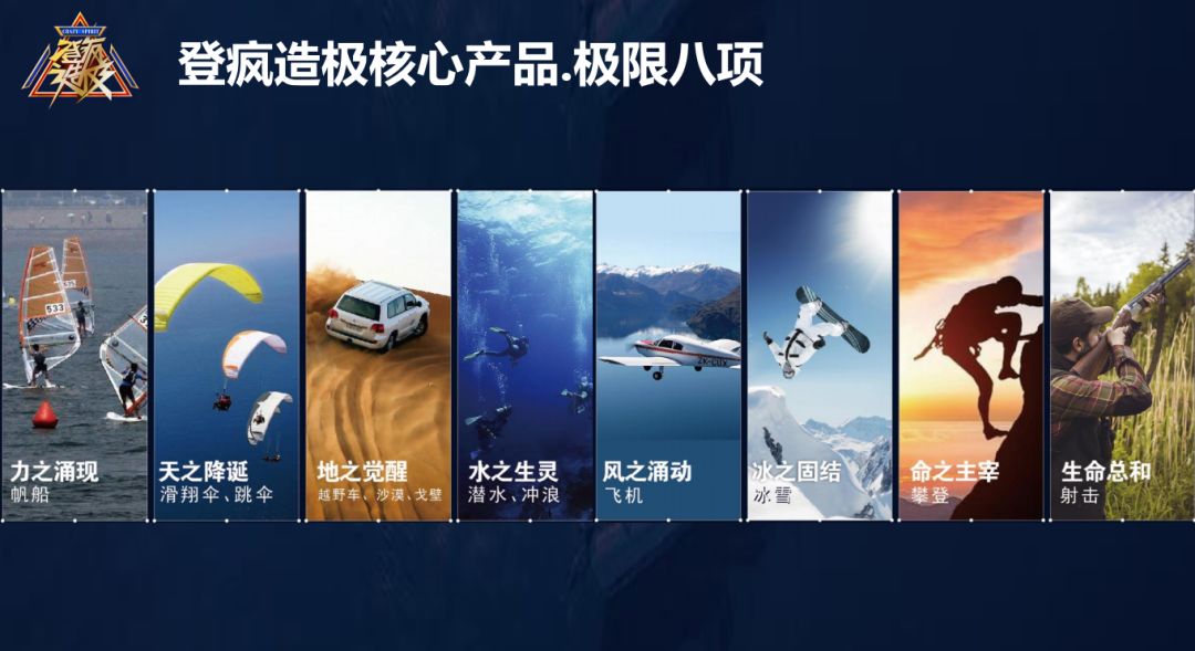登疯造极提出的“极限八项”分别是力之涌现-帆船;天之降诞-滑翔伞、跳伞;地之觉醒-越野车、戈壁;水之生灵-潜水、冲浪;风之涌动-飞机;冰之固结-冰雪;命之主宰-探险;生命总和-射击。