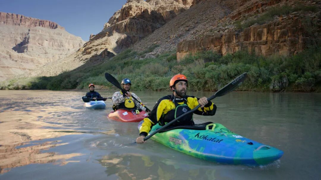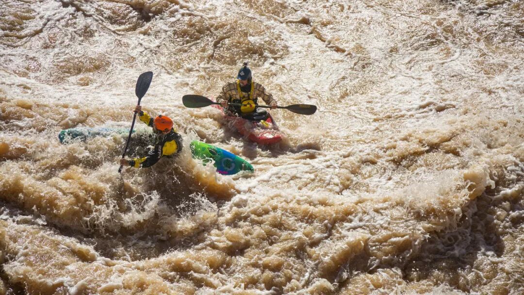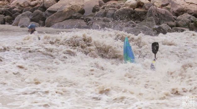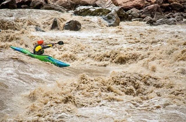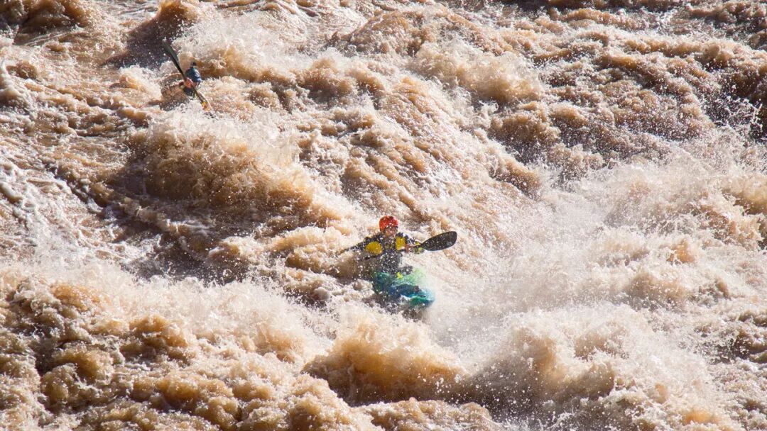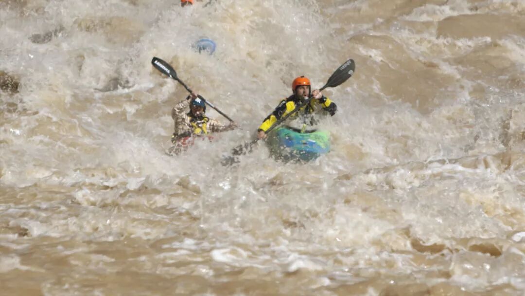 浑浊的河水中,一叶皮划艇正在艰难的前行
