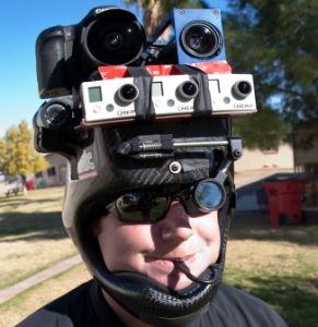 也有一些对画面和画幅要求更高的人采用特制的底座和安装方法,把大型相机甚至是多个相机都安排在头上。