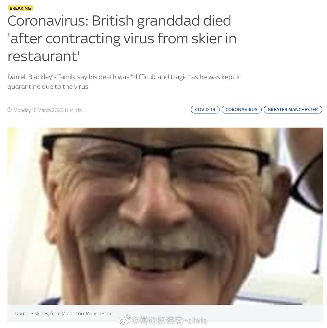 数字是冰冷的,但冰冷的数字背后,是无数个“时代一例灰”的故事。比如一位88岁的英国老爷爷Darrell三月初因为新冠而去世,他没有任何的境外旅行史,只是在餐厅和一位从意大利回来的滑雪爱好者吃了一顿饭而被感染。