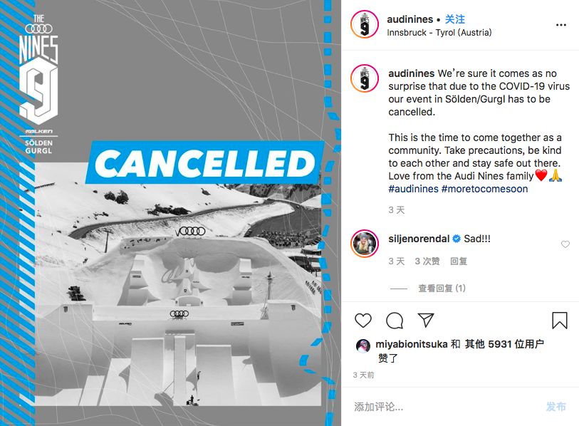 比如每年万众期待自由式滑雪的盛会——Audi Nines(九骑士)就在上周官宣,因为受新冠疫情的影响,本年度的九骑士正式取消。